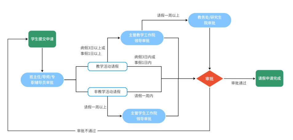 3.非教学活动请假。请假1周内(含1周),由班主任/导师/专职辅导员审批;超过1周的,需由学院主管学生工作的院领导审批。