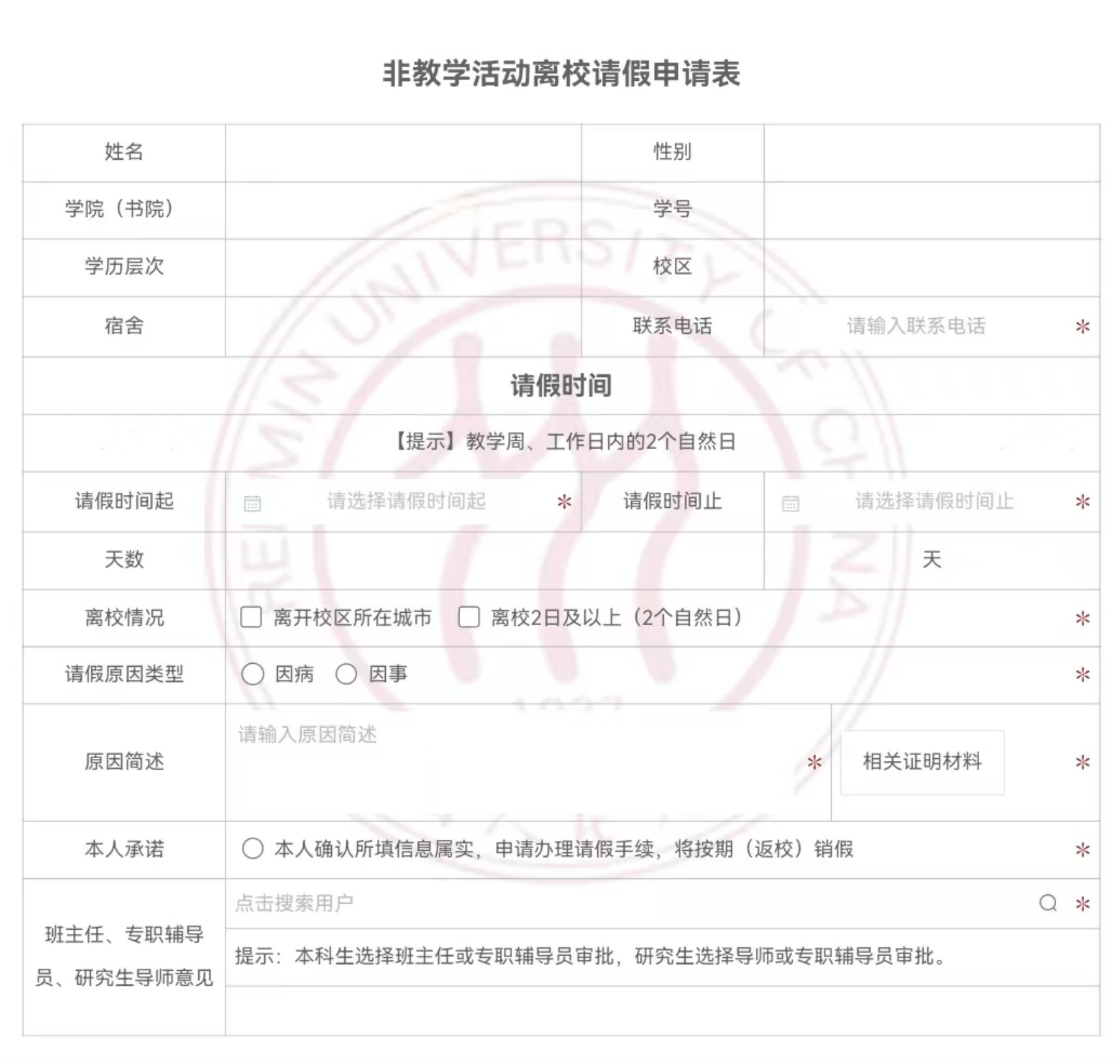 3.如确有特殊情况需请事假的,学生申请时需提交相关事由真实有效的证明材料。