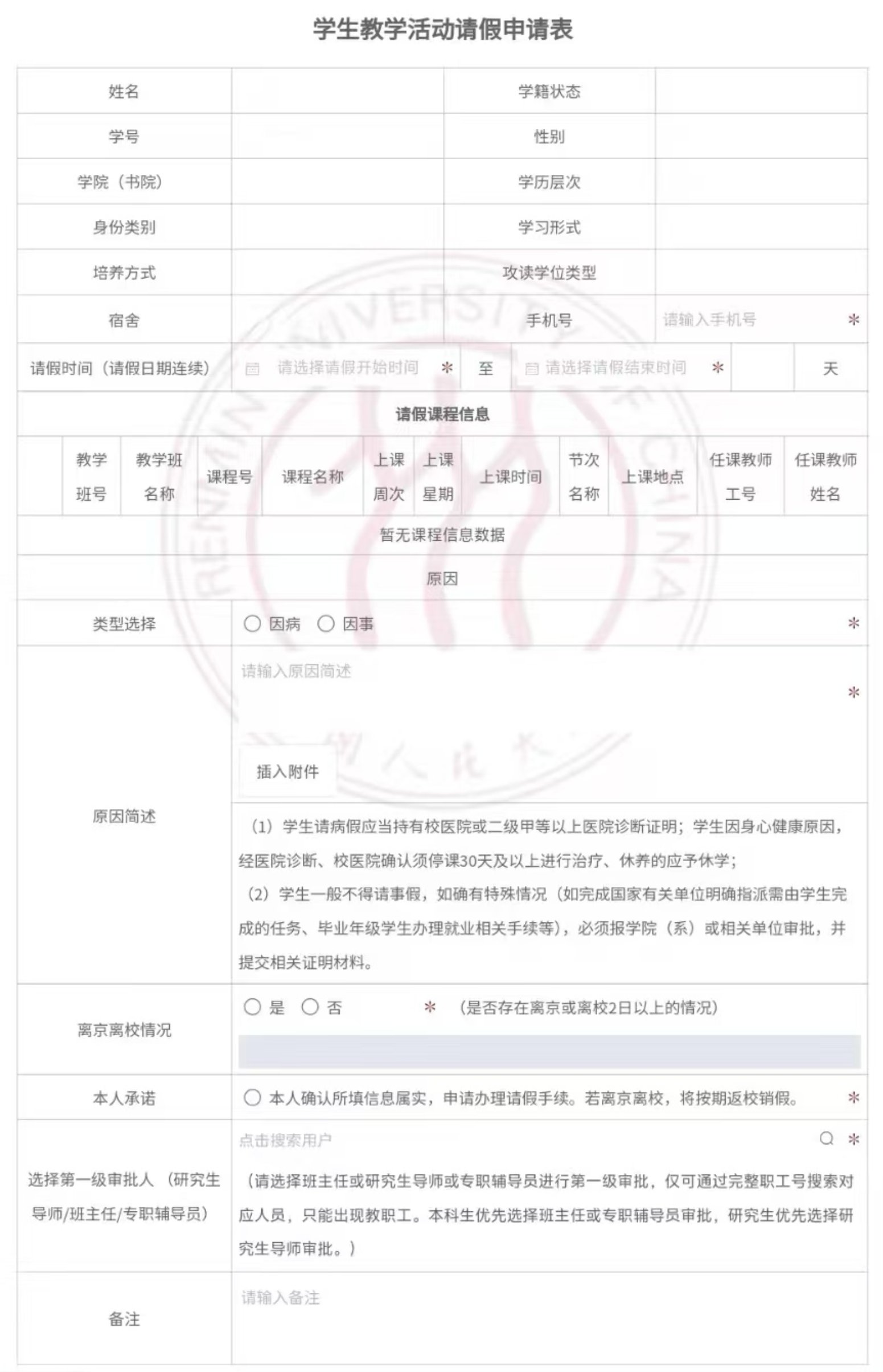 4.如同一原因需要同时办理教学活动和非教学活动请假,均需单独提交请假申请。未按要求办理请假手续或请假未获批准而擅自不参加教学活动、在教学周(不含国际小学期)内擅自离校的,将按规定给予相应纪律处理。