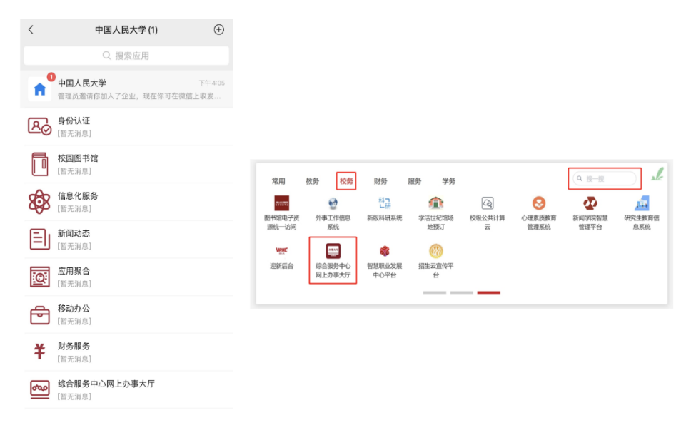 1.手机端微信通讯录点击“中国人民大学”——“综合服务中心网上办事大厅”或电脑登陆微人大,点击校务-综合服务中心网上办事大厅。