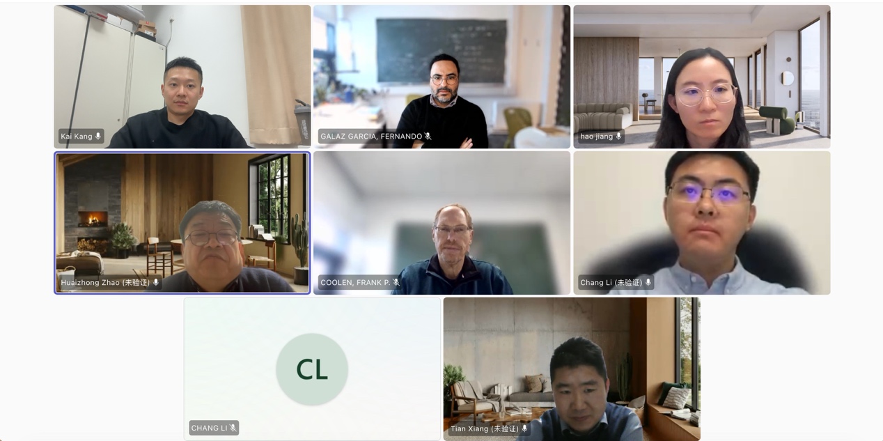 北京时间2025年12月9日晚18点,中国人民大学数学学院与英国杜伦大学数学科学系举行首次线上合作洽谈会,杜伦大学数学科学系Fernando Galaz-García(Chair of the Internationalisation Committee)、Frank Coolen(Director of Research)和Huaizhong Zhao(Faculty Representative)三位教授参会,中国人民大学数学学院副院长姜昊、教授向田、副教授李畅和外事秘书康恺参会。